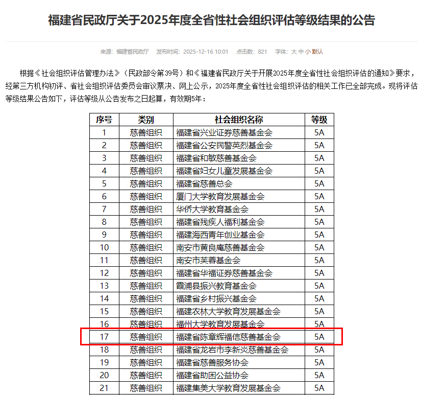12月16日,福建省民政厅公告2025年度全省性社会组织评估等级结果,福建省陈章辉福信慈善基金会再次荣膺最高“5A级社会组织”。这不仅是基金会长期努力的成果,更是对其在内部治理、项目执行、财务透明及社会成效等各方面规范运作、专业高效的权威肯定。