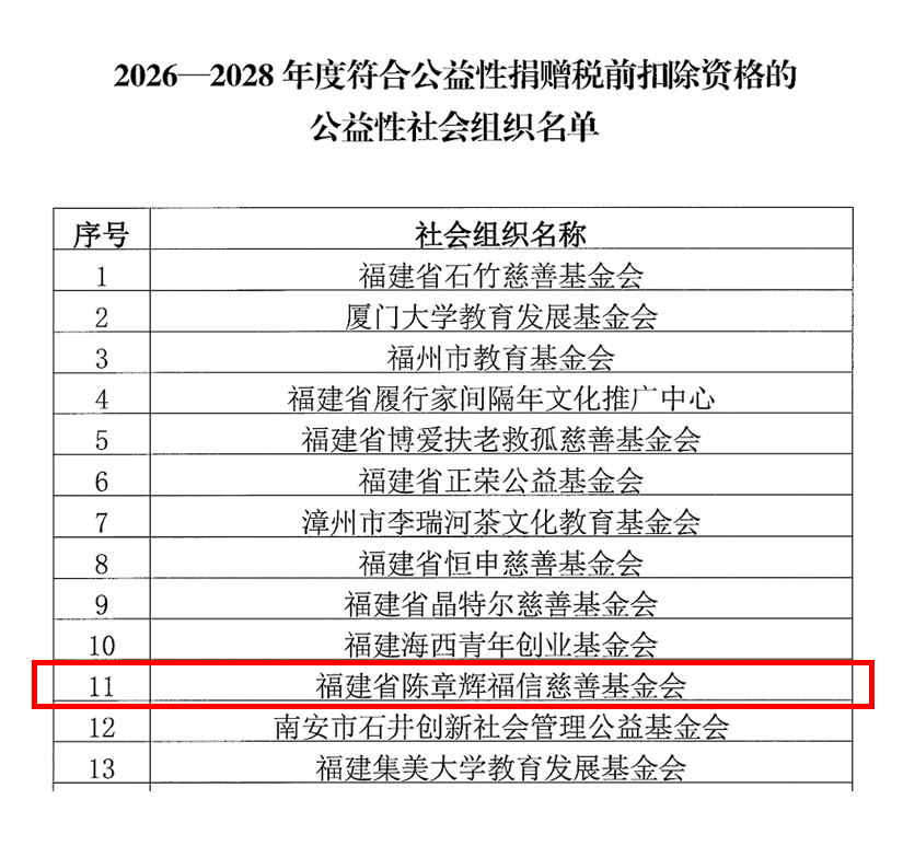 近日,福建省财政厅、国家税务总局福建省税务局、福建省民政厅联合发布闽财税〔2025〕18号文,正式确认福建省陈章辉福信慈善基金会获得 2026至2028年度公益性社会组织捐赠税前扣除资格。这标志着基金会的公信力与运作规范性再次获得权威认可。